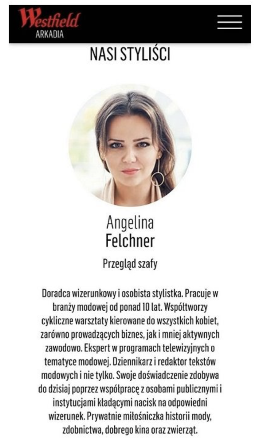Westfield Arkadia. Jadę w stresie do centrali, mylę ulicę, spóźniam się srogo. Rozmowa idzie świetnie. „Od kiedy może pani zaczynać? I czy potrafi pani pisać?” Z Arkadią wprowadzam nową usługę dla klienta — start przeglądów szaf i bloga. Nie wierzę, że się udało. Usługa przez lata topowa w Polsce. Setki klientek.